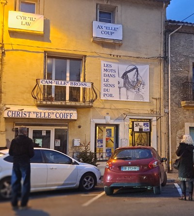 J'ai eu un coup de cœur pour celle du salon Christ''elle'' coiff, sa typographie légèrement vintage, son inventivité langagière audacieuse, qui tout à coup faisait apparaître le Christ, le pronom « elle », et disparaître le e final du verbe !