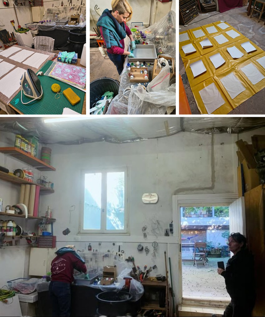 Dans le cadre de ses recherches créatives, Eva Debreceni s’est installée dans l'atelier de production avec beaucoup d’espace et un point d’eau pour expérimenter l'état fluide qui était au centre de sa dernière résidence. Elle a pu essayer des compositions à base d'encre et d’eau qui nécessitent de long temps de pause, formules et processus sur papier amenés à être transférer dans un second temps sur son corps. Pour l’exploration de cette technique sur sa peau, l'artiste prévoit une autre période de résidence pour affiner et mettre au point ses premiers résultats.
